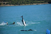 מכרייסטצ'רץ המשכנו ברכב שכור לקאיקורה. אזור יפהפה ליד הים, עם הרים עצומים שמתנשאים מן החוף גבוהים ככה שמתהדרים בשלג גם בשיא הקיץ הניו זילנדי. אבל זה לא לב העניין. המפרץ של קאיקורה הוא ביתם של כמה מיני דולפינים שחיים שם בלהקות עצומות. בעיקר דולפינים מסוג דאסקי שהם שחורים-לבנים ויפים, וידועים בהיותם הדולפינים הכי לולייניים וקופצניים שיש. אז לא נפליג איתם? ברור שעלינו על סירה, ואפילו קפצתי לשחות איתם קצת. חתיכת חוויה מדהימה. רואים אמנם טוב יותר מהסירה כי יש איזשהו מרחב, והם גם מתקרבים מאד, אבל להיות קרובה איתם במים היה חתיכת דבר. הם שוחים קרוב ומשחקים. אחד עשה סלטה ממש מעלי, ואחד אחר בא מתחתי במרחק נגיעה והזמין אותי למשחק שבו מסתובבים ומסתובבים בשחיה במקום. ההפלגה הזאת עם כל הדולפינים האלה תהיה אחת החוויות הכי זכורות לכולנו מניו זילנד אני חושבת. עם המשחקי תופסת של הדולפינים עם הסירה, הסלטות, הכמויות של הדולפינים. אין לתאר.